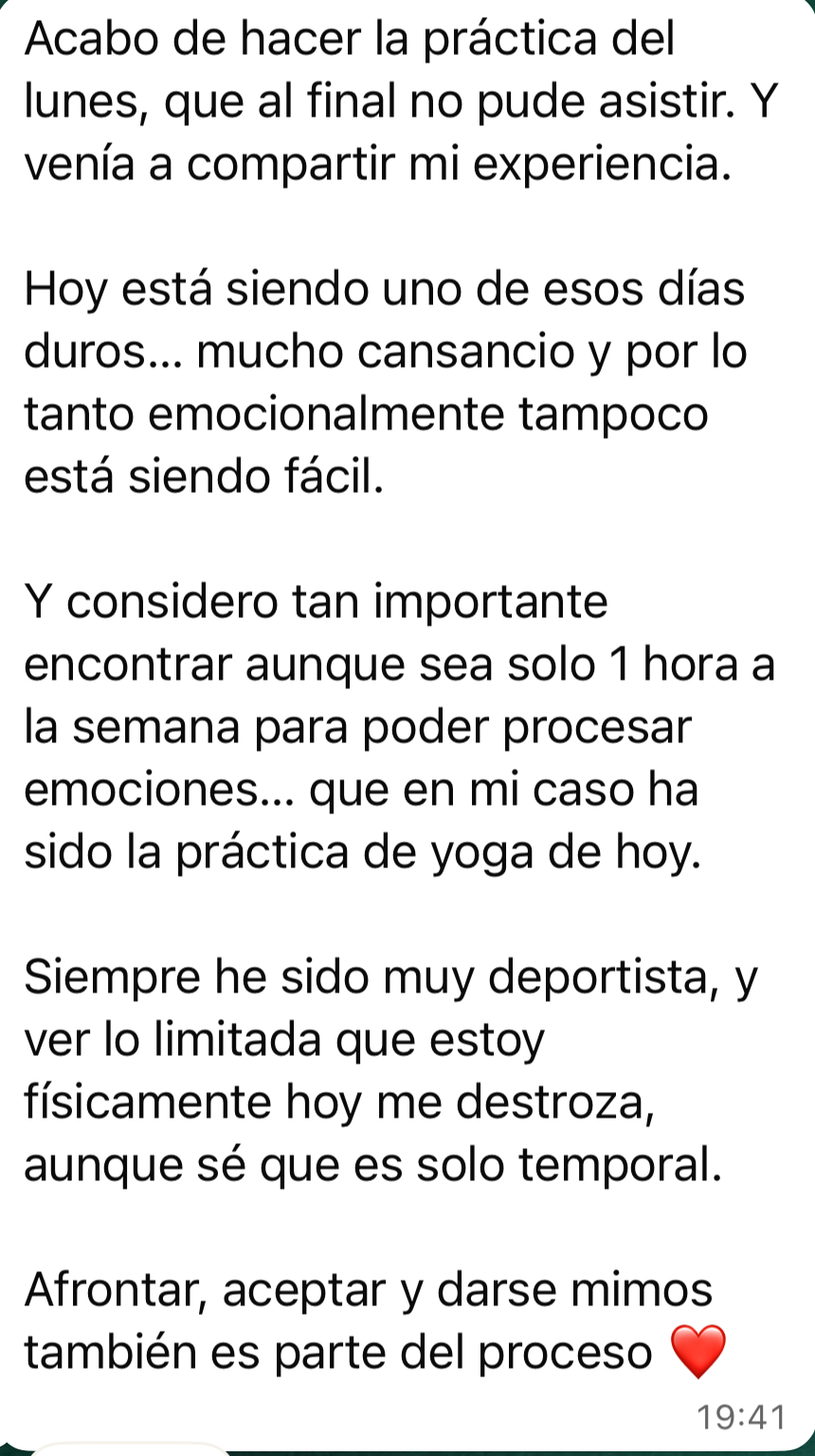 ¡Perfecto! Aquí no necesitas ser flexible ni tener experiencia. Te voy guiando paso a paso, con modificaciones para cada nivel. Si tu única postura de yoga ha sido el "sofá savasana", este es tu lugar ideal para empezar.